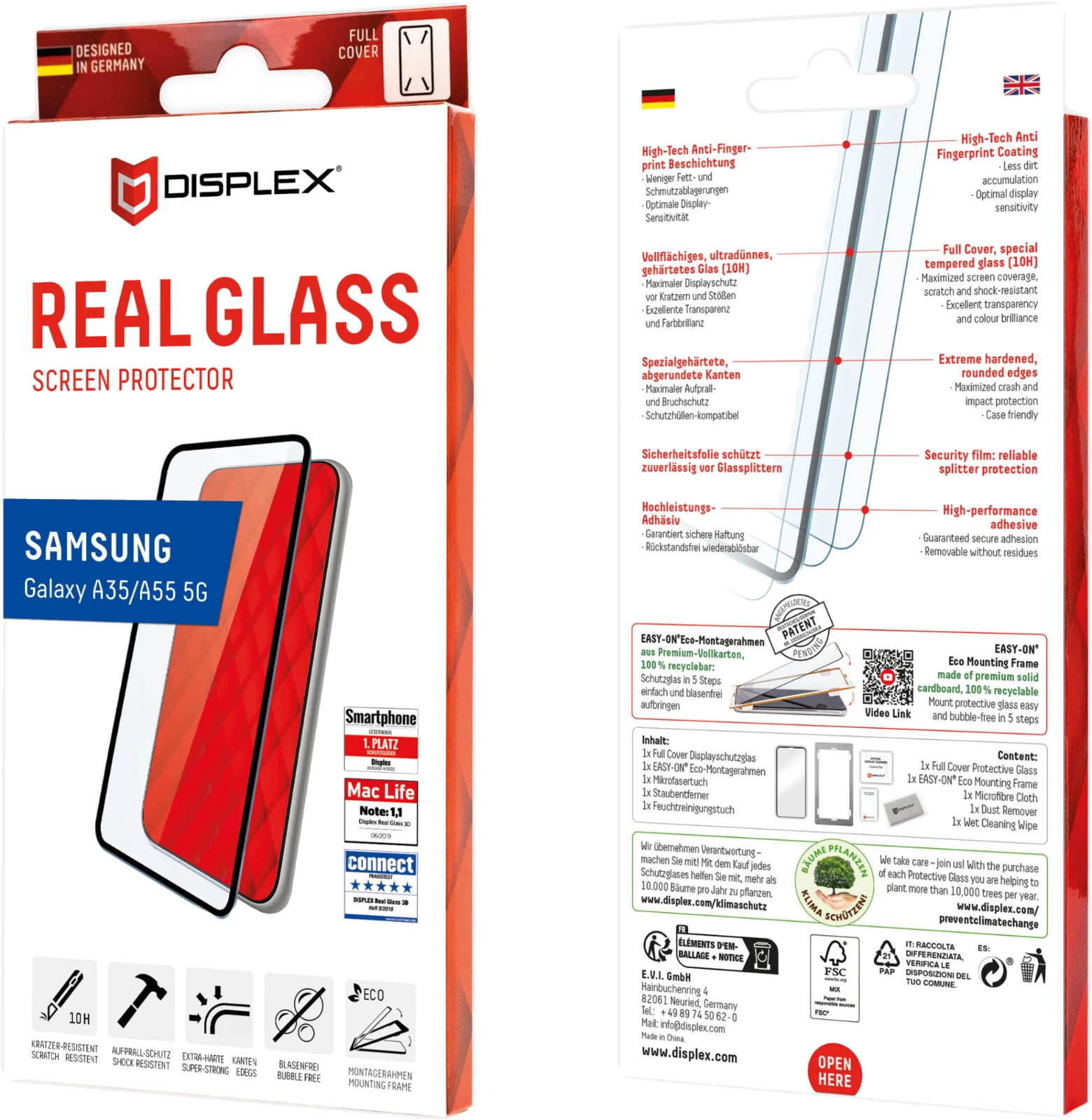 Kein schiefes Aufliegen, keine verdeckten Öffnungen für Lautsprecher oder Mikrofone, und keine Blasen. Der Eco-Montagerahmen besteht zu 100% aus recyclebarem Premium-Vollkarton und ist umweltfreundlich recycelbar.